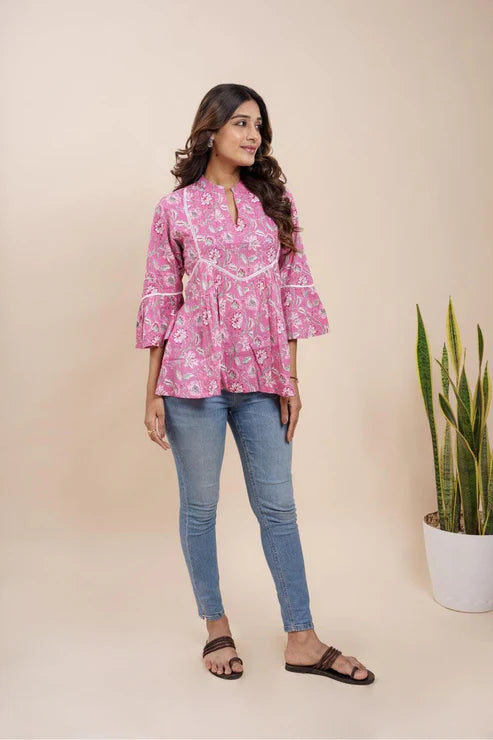 women pink beautiful designer floral printed cotton tunic top short kurti